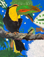 I picked up another pre-used canvas which had a paining of a toucan. I was going to use it for something else, but thought I'd try my version of a toucan. They are amazing birds and I wanted to paint it without reference. I did eventually look at a couple pictures, but not while I was painting. Working on the tree and leaves ended up being equally important practice for me.